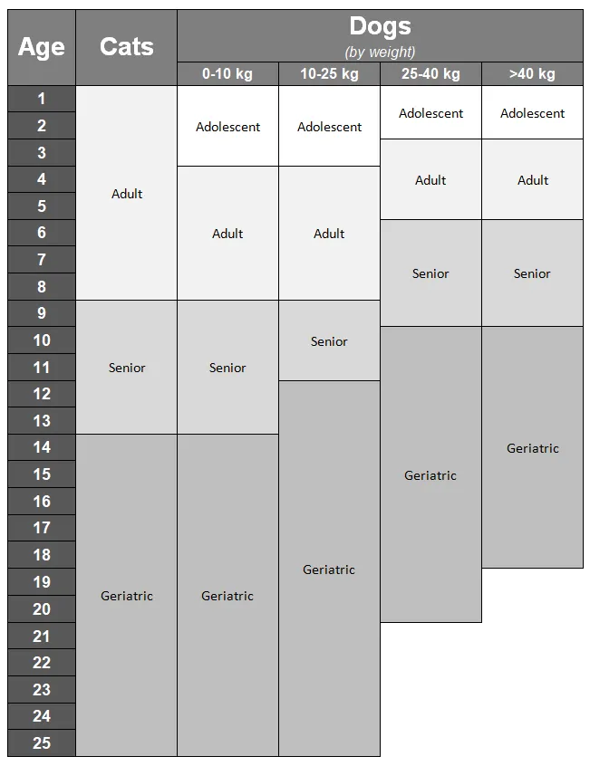 Use the chart below to determine your pet's age category: